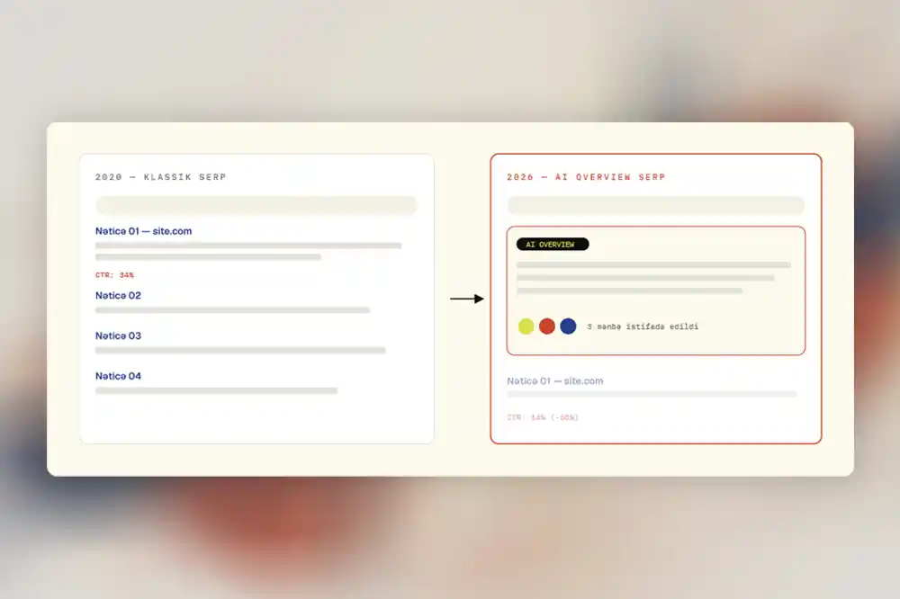 Ahrefs-in dekabr 2025 məlumatına görə, AI Overview-lar birinci sıradakı nəticənin klik dərəcəsini 58%-ə qədər azaldır. Bir sənədləşdirilmiş halda impressionlar ildən-ilə 27.56% artdığı halda kliklər 36.18% azaldı, CTR isə 5.98%-dən 3.35%-ə düşdü sıralama isə 14.01% yaxşılaşmışdı.