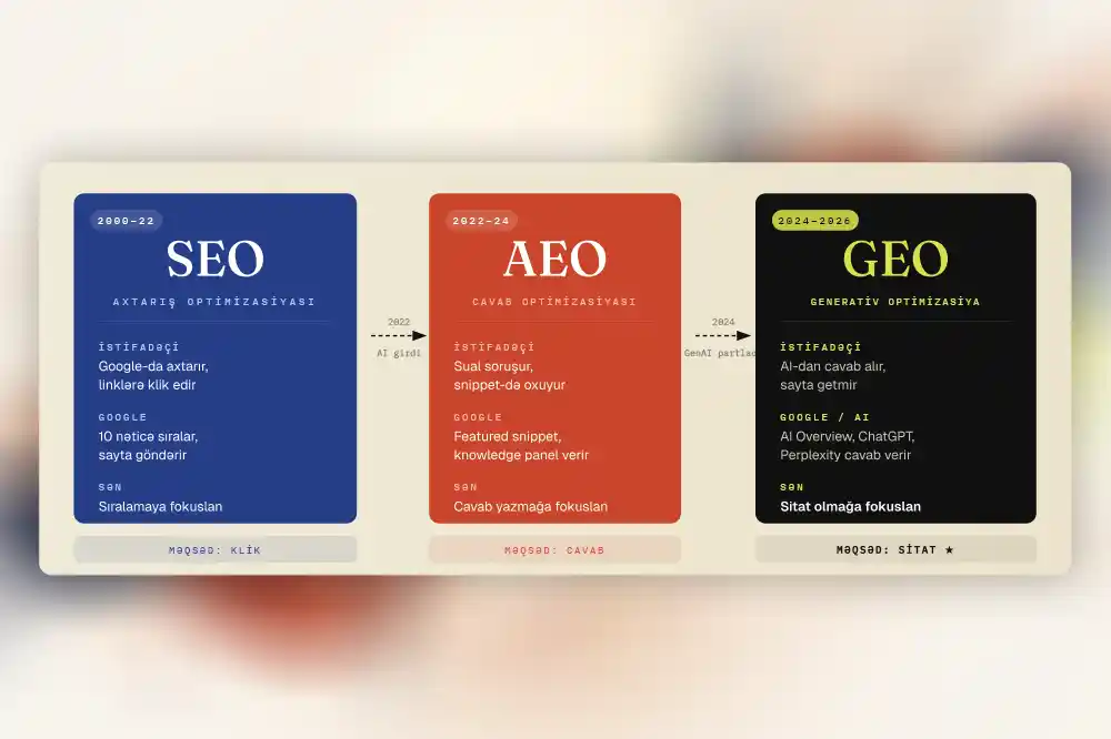 SEO ölmürdü - GEO (Generative Engine Optimization) adlı yeni bir formaya çevrildi. Məqsəd artıq yalnız sıralamada deyil, AI cavablarında sitat olmaqda.